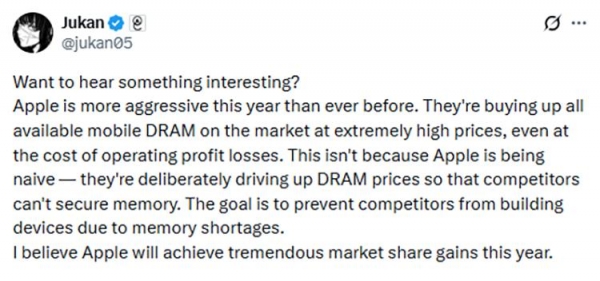 苹果似乎也是这么想的,根据相关人士的爆料,苹果正在以极高的价格对DRAM市场进行疯狂扫货,对于三星、SK海力士等供应商开出的天价采购费用照单全收,即使是亏本也在所不惜,目的就是为了阻止其它竞争对手买到DRAM芯片,并会使得芯片价格长期处于一个非常高位的境地。
