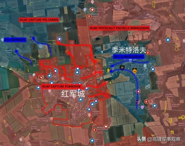 关于乌克兰军队在红军城地区的困境,西方媒体也无法隐瞒。现在关于"波克罗夫斯克(红军城)陷落"和"米尔诺赫拉德(季米特洛夫)被包围"的消息已经满天飞了。包括欧媒和澳媒反映战场实时动态的地图,也将红军城和季米特洛夫东南部更新600为红色的"俄控区"。11月16日,俄军已推进至红军城市区北部边缘的两个养猪场和最后一片居民区,对季米特洛夫的包围圈进一步收紧。