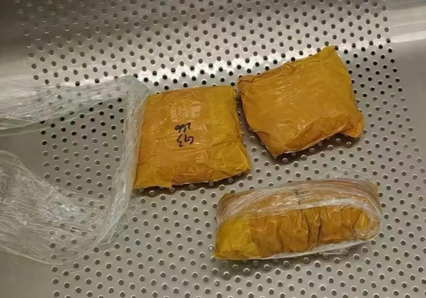 当日,海关关员在皇岗口岸旅检大厅对进境旅客进行监管时,发现一名身着黑色宽松衬衫、牛仔裙子的女性旅客神色紧张、举止异常,随即对其进行拦截检查。经查,在该旅客胸部处发现用保鲜膜缠绕固定的黄色胶带包装物2袋,在其裙下打底裤裆部发现同样的黄色胶带包装物1袋。拆开包装袋后,查获黑色的疑似珍珠共计626粒。