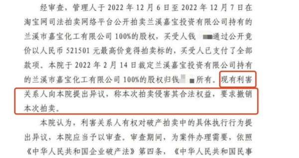面对媒体采访,兰溪市法院的工作人员解释说,撤销拍卖是经过谨慎考虑的,主要是当初破产管理人处置资产的时候程序不当,"那股权的实际价值比拍卖价高太多了,根本不是一倍两倍的差距"。
