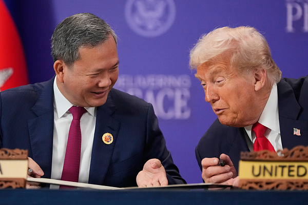 去年10月,特朗普与柬埔寨首相洪玛奈在签字仪式上交谈 视觉中国