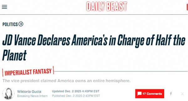 美国《野兽日报》网站12月2日报道,美国副总统万斯为美军在加勒比海袭击所谓"运毒船"行动辩护时声称,整个西半球属于美国管辖。