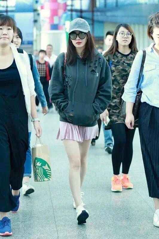 众所周知,大幂幂很喜欢上短下长或者下半身失踪的穿法,到了秋天同样可以通用。比如她这件墨绿色的卫衣,下面搭配粉色百褶学院风小短裙,整个人就很学院,同时也不会觉得很冷。