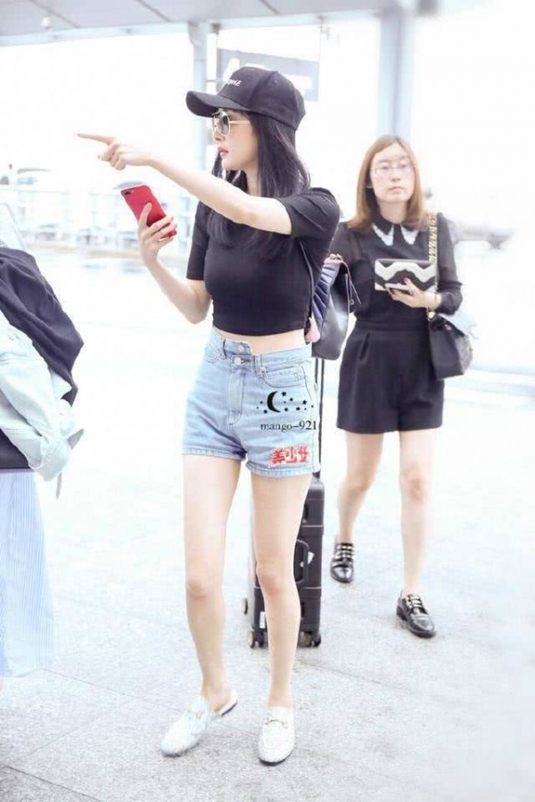 露脐黑色紧身上衣将杨幂的迷人酥胸凸显的十分明显,错扣的牛仔短裤尽显俏皮,戴上棒球帽穿上小白鞋活力四射充满时尚感,网友仍不住在她牛仔裤上P上美少女。