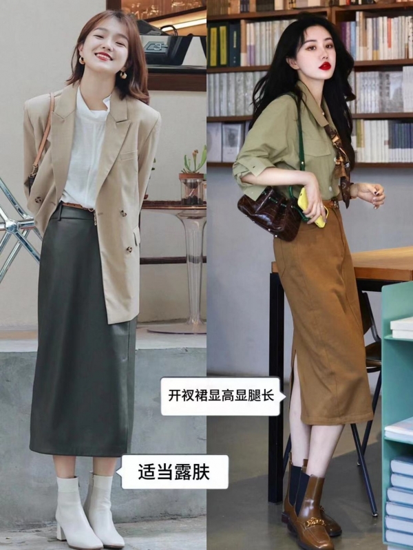 最后我们所搭配的靴子还有我们搭配的长裙在单品的衔接上不要衔接得过于紧密,比如这种长裙搭配上长靴就会让我们的双腿完全被遮挡住,这种衔接得过于紧密的穿搭组合就太容易显腿粗显笨拙了。 若是能够在腿部保持一定的留白,当裙摆和靴子之间有一定的空间露出我们的腿部肌肤,就会显得更轻盈,也更有呼吸感。