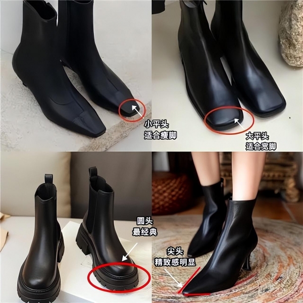 并且选择靴子也有不同的鞋型,我们平时如果要买靴子,会考虑到个人的脚型去选择不同的鞋头,鞋头大致可以分为圆头,尖头以及平头这三种,而其中最流行的便是平头,平头设计适合脚宽大一些的女生,所以更不挑人。