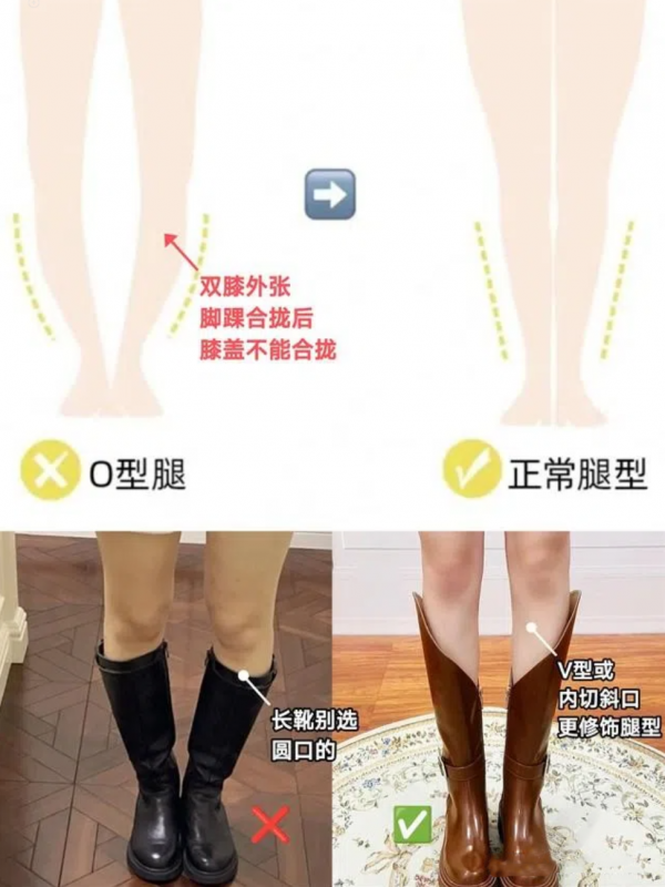 双腿的外部轮廓表现出来就是腿型,O型腿,X型腿和XO型腿都是典型。O型腿双膝外张,脚踝合拢后,膝盖不能合拢。这种腿型最适合选小腿肚子以上膝盖以下的长靴。但千万别选圆口款式,选择V型或内切斜口更能矫正腿型哟~