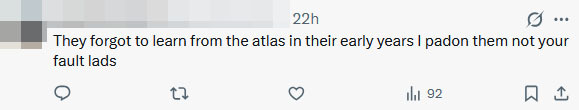 谅解的语气也很扎心:"他们只是早年间忘了学学地图册,我原谅他们了:不是你们的错。"