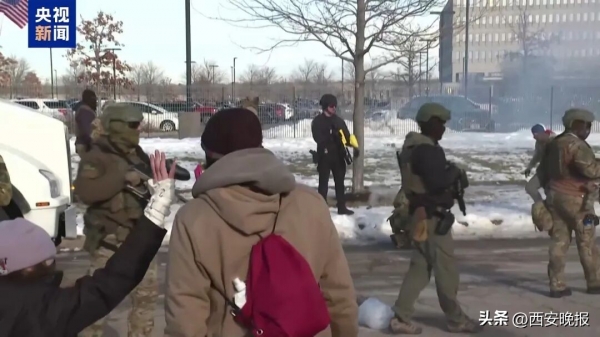 央视记者 刘旭:我身后就是明尼阿波利斯市的联邦执法机构大楼,在美国白人女性古德被枪杀之后,这里成为每天抗议人群和执法人员发生冲突最激烈的地点。隔着大概几米的距离,抗议者与执法人员发生了非常激烈的言语冲突。在现场,能够看到抗议者多次跟执法人员发生轻微的冲突,执法人员还发射了驱散人群的化学喷雾等。