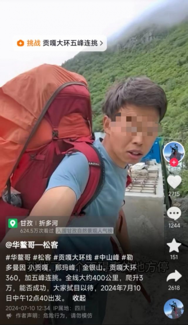 近日,多位驴友发帖称,"华鳌穿越第一人"、西安00后小伙房某某(网名"松客")在徒步贡嘎大环线途中已经失联15天。7月25日中午,上游新闻记者从前方组织救援的相关人员处获悉,目前天气不好,仍未找到"松客"。