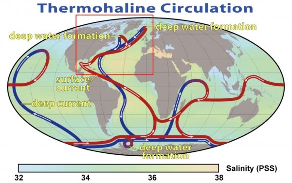 深海的氧气通常来自环流的输送。简单来说,温盐环流像一条巨大的传送带,连通了表层和深层的海水。表层富氧的海水下沉后,为深层的海水带去了氧气。(图片来源:Robert Simmon, NASA)