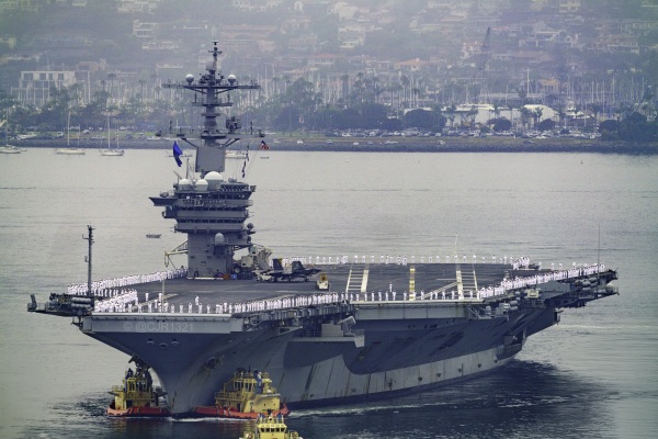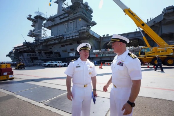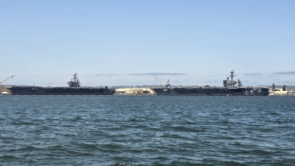 据美国《圣迭戈联合论坛报》当地时间24日报道,美国海军两艘"尼米兹"级核动力航空母舰--CVN-73"乔治·华盛顿"号与CVN-76"罗纳德·里根"号,正在圣迭戈湾内进行"任务交接",报道对此形容称,这是一项"罕见而棘手"的活动。