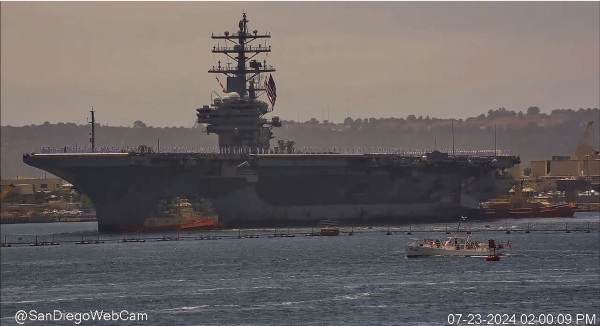 当地时间7月23日下午,CVN-76"罗纳德·里根"号抵达圣迭戈社交媒体X账号"圣迭戈网络摄像头"(@SanDiegoWebCam)视频截图