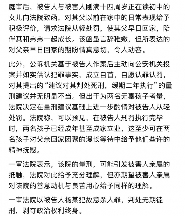 这个杀人偿命,属于天经地义。杨某如此残忍杀害自己的妻子,那么按道理他也应该被判死刑。但是法院在量刑的时候,也考虑到了孩子的因素。这妈妈死了,孩子爸爸在死的话,那么两个孩子就一下子失去了父母,变得无依无靠了。还有就是杨某的女儿给法院写了信,来为父亲求情。他希望父亲能被早点放出来,从而继续照顾她和弟弟,陪伴弟弟长大。
