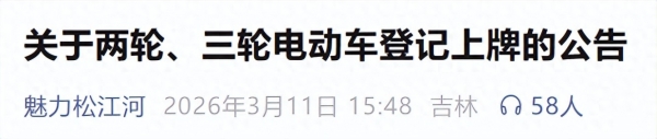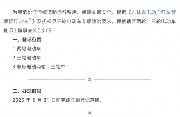 近日,吉林省抚松县集中开展辖区内电动车备案登记工作,为当地二轮、三轮(含非标车)进行备案登记,要求在2026年5月31日前完成车辆登记落牌,6月1日起开始上路严查。