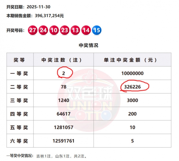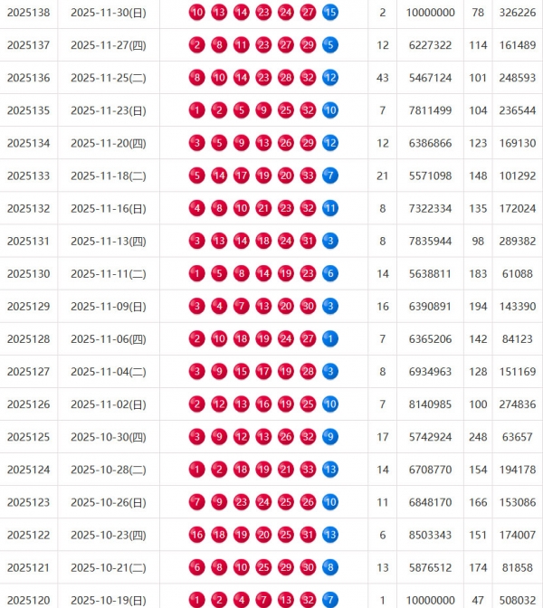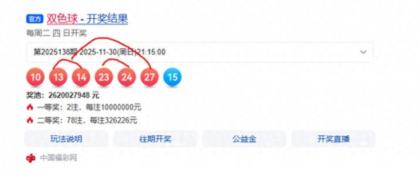 双色球第2025138期开奖号码:10、13、14、23、24、27+15