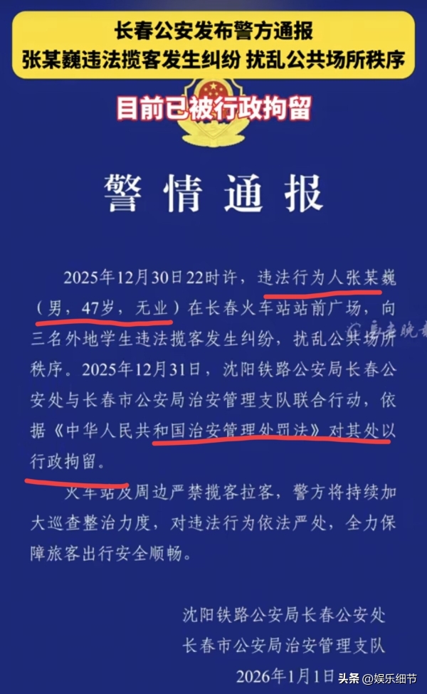 通报中称,张某巍今年47岁,无业,12月30日在长春火车站向3名外地学生违法揽客,发生纠纷。