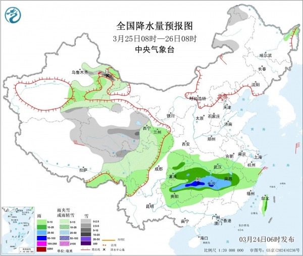 昨天(3月23日)贵州、湖南、江西出现中到大雨,青海、西藏部分地区出现雨雪天气。