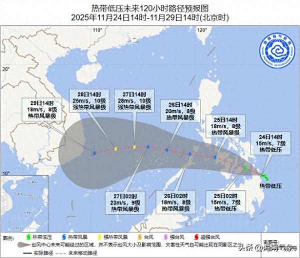 海南省气象部门提醒,热带低压可能于未来24小时内加强为今年第27号台风,并于25日夜间进入南海南部海域,逐渐趋向越南南部沿海,最强可达强热带风暴级,请海上平台和各类船只迅速做好避风措施,请相关部门持续关注海南省气象局最新预报。