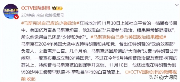 马斯克在2024年美国大选中支持特朗普和共和党,曾出任特朗普的"政府效率部"负责人,之后离开白宫。几个月前,马斯克还因所谓的"大而美"法案与特朗普公开闹掰,一度宣布要成立新的"美国党"。不过在今年9月特朗普政治盟友查理·柯克的葬礼上,特朗普与马斯克被拍到握手并交谈。11月18日,他还出现在特朗普为到访的沙特王储穆罕默德·本·萨勒曼举行的白宫晚宴上。