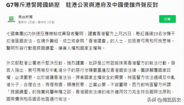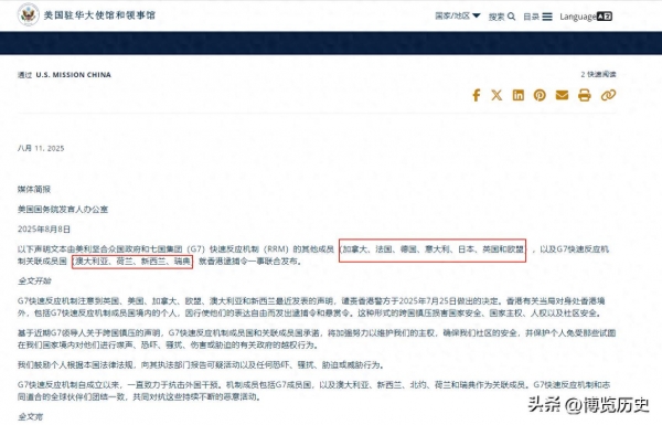 当地时间8月8日,以美国为首的七国集团快速反应机制成员国及其盟友,总计33个国家,突然发表联合声明,将矛头直指中国内政,谴责香港警方对19名乱港分子发出的全球通缉令。