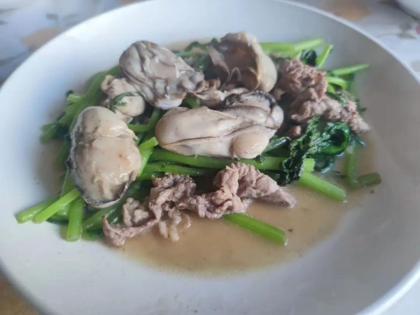 第四样:茼蒿肥肉炒生蚝,人精神,运气旺