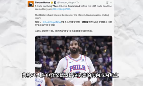 休斯顿火箭中锋亚当斯因为脚踝扭伤赛季报销以后,球队一直在市场上寻找新的中锋进行引援,他们最新的目标是费城76人的中锋德拉蒙德。