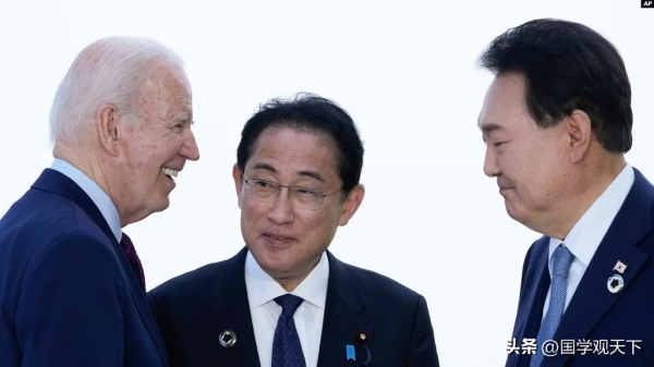 2023年5月21日,在广岛七国集团峰会期间,美国总统拜登与日本首相岸田和韩国总统尹锡悦举行三方会议