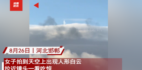 8月26日,河北邯郸,女子拍到天空上出现人形白云,拉近镜头一看吃惊,只见这个人形的云朵还在行走,像极了电视剧里的"天庭仙人"。女子称当时风朝着南面在刮,但是这个"仙人"却朝着东面走。
