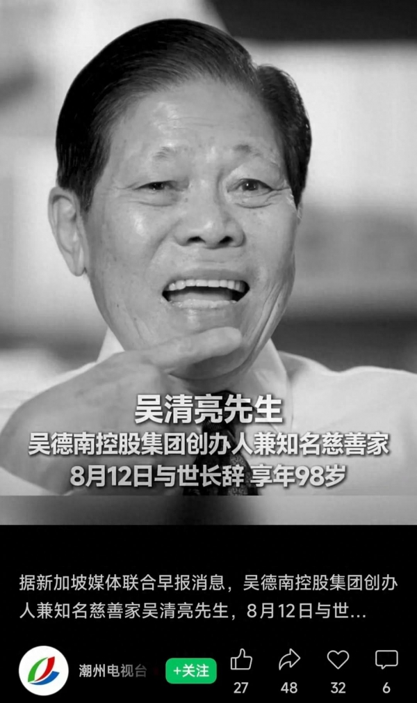 2025年8月12日,立邦品牌创始人、吴德南控股集团创办人吴清亮先生在新加坡安详离世,享年98岁。吴清亮的逝世引发了各界的广泛关注,他不仅是一位杰出的企业家,更是一位心系桑梓、不忘根本的华人典范。