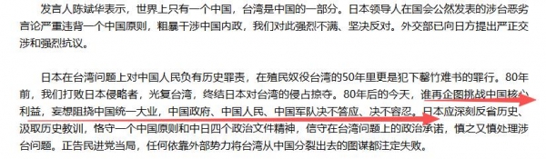 对此,中国外交部和国台办迅速对日方挑衅言论作出强硬警告回应,国台办的警告更加明确:"谁在企图挑战中国核心利益,妄想阻挠中国统一大业,中国政府、中国人民、中国军队决不答应、决不容忍。"