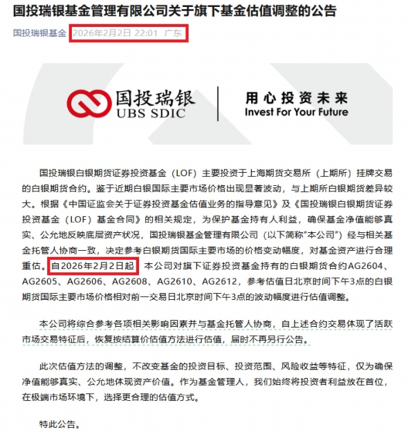 国投瑞银基金表示,自2026年2月2日起,该公司对旗下证券投资基金持有的白银期货合约 AG2604、AG2605、AG2606、AG2608、AG2610、AG2612,参考估值日北京时间下午3点的白银期货国际主要市场价格相对前一交易日北京时间下午3点的波动幅度进行估值调整。