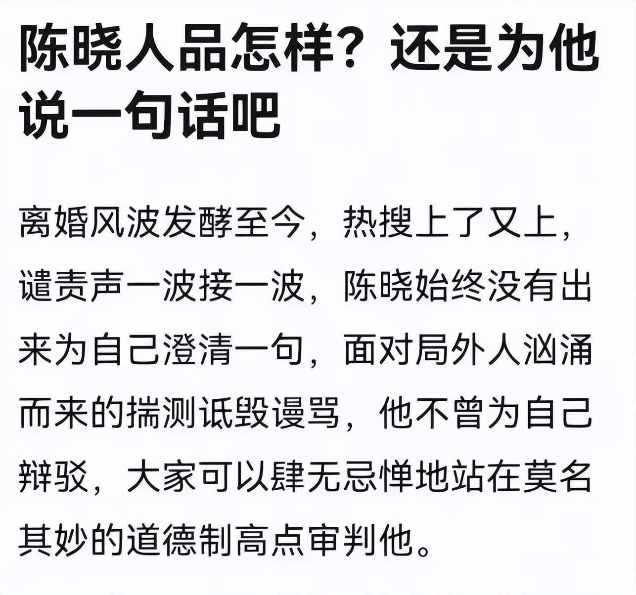 和女方的舆论旋涡形成鲜明对比的,是陈晓的全身而退。离婚后他依旧保持低调,鲜少公开露面,社交平台也维持静默状态。