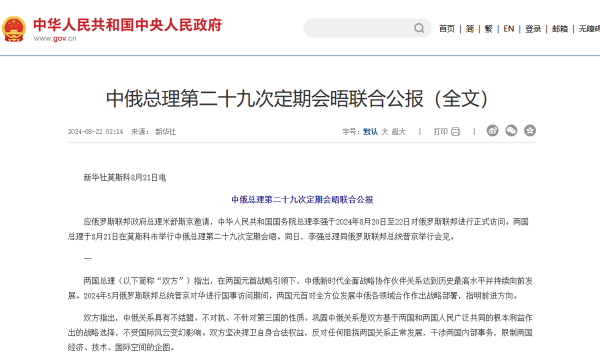 8月20日至22日,中方应俄方邀请进行访问行动,双方达成相应共识,俄方认同并称赞中方为稳固国际局势做出的切实努力,中方也将俄方视为优先伙伴,坚持互相尊重的原则。