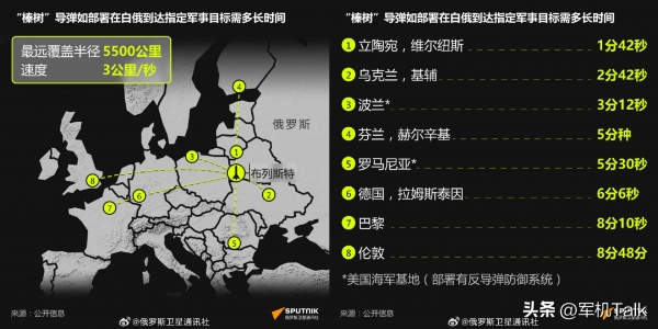 普京已与白俄罗斯总统卢卡申科达成共识,将于明年年底前在白俄罗斯部署"榛树"导弹系统。根据俄星社制作的"榛树"导弹从白俄罗斯到北约在欧洲的军事基地所需时间的信息图,导弹从布列斯特飞到乌克兰基辅仅需2分多钟,飞到英国伦敦仅需8分多钟。"榛树"导弹部署在白俄罗斯对北约在欧洲的军事基地构成的威胁是显而易见的,甚至可以毫不夸张地说,人还没反应过来,导弹就已经飞到头上。