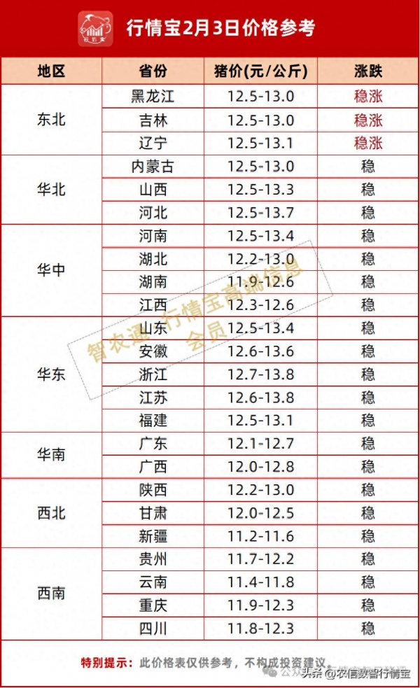 今日全国生猪市场延续节后回暖态势,整体呈现普涨格局。从区域表现来看,北方地区尤其是东北一带领涨全国,涨幅明显高于其他区域,反映出当地供需关系阶段性偏紧。华北地区紧随其后,养殖集团月初调价带动市场情绪,屠宰企业采购节奏加快,进一步推高价格。华东作为传统消费重地,月初出栏量相对有限,叠加下游补货积极性提升,支撑猪价稳步上行。华中、华南地区同样维持上涨趋势,养殖户普遍持惜售心态,挺价意愿较强,而终端对节后备货仍有一定预期,形成短期利好。西南和西北地区虽涨幅略缓,但整体亦呈稳中偏强走势,仅个别边远区域价格保持平稳。