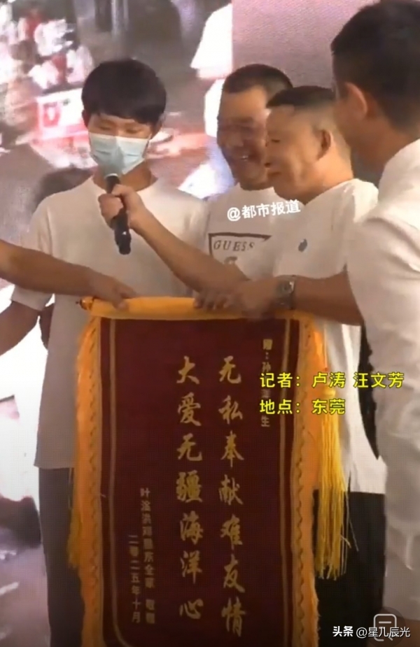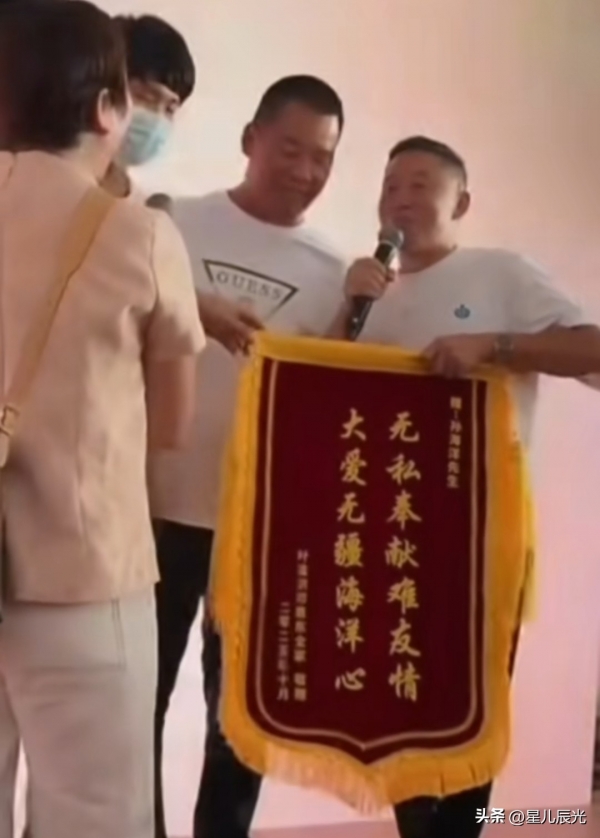 在现场,叶锐聪妈妈还让孩子认了孙海洋为干爸爸,孩子叫了一声干爸爸,妈妈还把一面锦旗送给孙海洋,上面写着"无私奉献难友情,大爱无疆海洋心"。