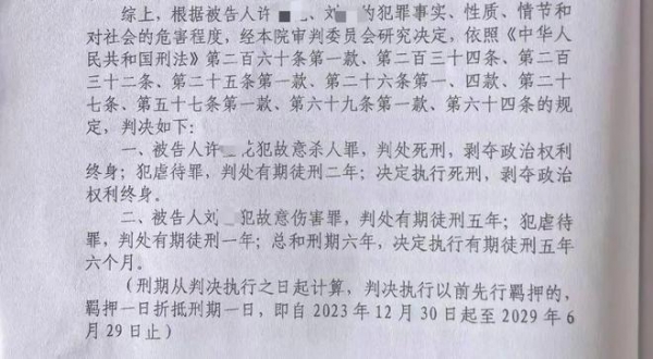 2025 年 4 月,一审法院作出判决,许某花犯故意杀人罪和虐待罪,决定执行死刑,剥夺政治权利终身;刘某犯故意伤害罪和虐待罪,决定执行有期徒刑五年六个月。然而,琪琪的生母认为对刘某的判罚太轻,准备上诉,希望法院能给予更公正的判决。