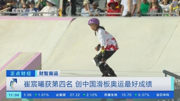 北京时间7月28日晚,巴黎奥运会滑板项目女子街式赛决赛落下帷幕,最终中国队的崔宸曦以241.56分的成绩排名第四,创中国滑板奥运最好成绩。