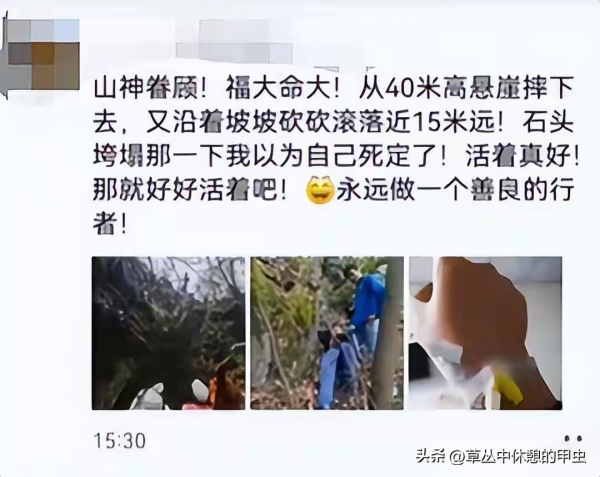 让人没想到的是,疑似坠崖的男子自己在朋友圈发了报平安的消息,还感慨自己福大命大。他说多亏山神眷顾,从40米高的悬崖摔下去后,又顺着坡坡坎坎滚了将近15米远,石头垮塌的那一刻,他还以为自己肯定活不成了,现在能活着特别庆幸,以后会好好活着。同时他还配了三张照片,看着是想跟大家说自己没事。