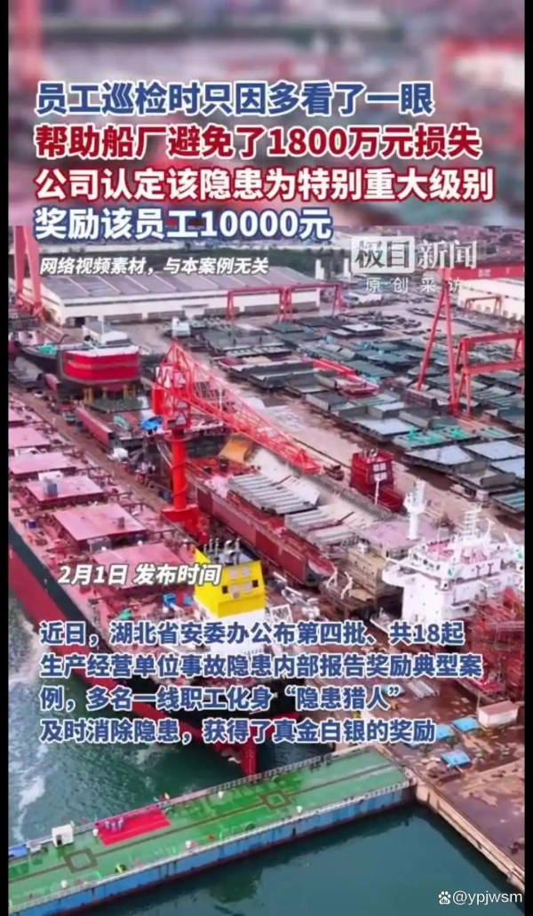 技术团队评估后倒吸一口凉气:这个支撑架扛着价值1800万元的船舶分段,再晚一步就可能坍塌,还会引发重大人员伤亡。公司将此隐患定为特别重大级别,奖励该员工1万元,授予"黄金猎人"称号,还把他的事迹拍成安全教育片全公司播放。