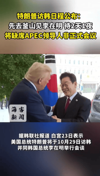 根据日程,特朗普将于29日早上前往釜山,与李在明会谈后,出席APEC工商领导人峰会午餐会并发表主旨演讲。当天晚上,他将与各国首脑一道出席工作晚宴。次日(30日),他将启程回国。