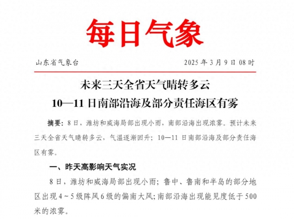 10日白天到夜间,全省天气晴转多云。南风,鲁西北和半岛地区4~5级阵风6级,其他地区3~4级。夜间最低气温:济南和鲁西北地区7°C左右,鲁中山区和半岛内陆地区3°C左右,其他地区5°C左右。最高气温:鲁中山区和半岛内陆地区14°C左右,沿海地区9°C左右,其他地区17°C左右。