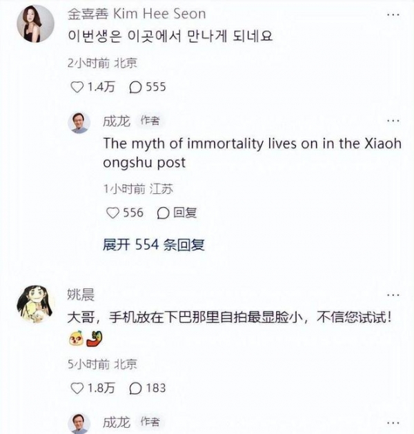 姚晨几乎是秒评:"大哥,手机放下巴那里自拍最显脸小,不信您试试!" 成龙回复得超快,还带了个笑脸表情:"谢谢小姚,这是我在小红书学到的第一招,回头就试试。"