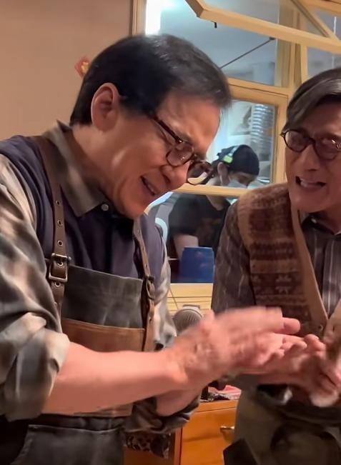 原来视频里快闪的片场片段,正是两人合作《捕风捉影》时拍的,当时成龙还在片场教梁家辉打戏动作,如今倒要反过来学自拍。