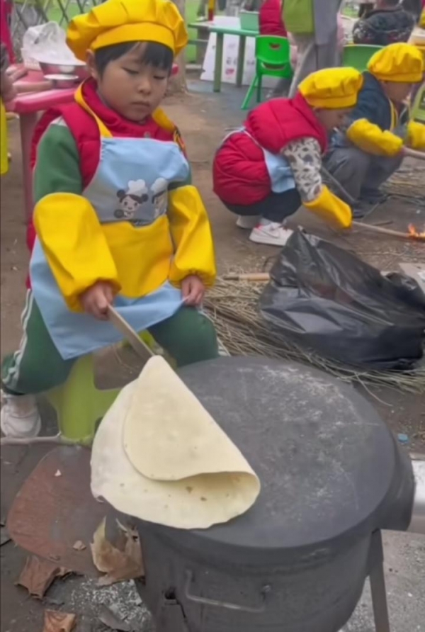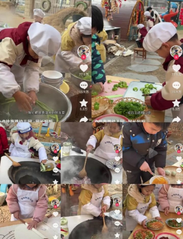 与此同时,在河南漯河的另一所幼儿园里,系着迷你围裙的孩子们正围着灶台忙碌着:有的踮脚翻炒锅里的鸡块,有的仔细筛检麦子,有的双手揉按面团。曾经热门的滑梯无人问津,孩子们却在这些充满烟火气的活动中找到了乐趣。