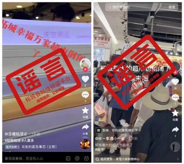9月7日下午,商丘市委网信办发布辟谣消息称,近日,"⑤傻姑凉¢""@~幸遇小~@"等网络账号在短视频平台发布关于"柘城幸福万家超市倒闭了"等信息,在互联网上迅速传播,引发当地群众到超市抢购商品,造成不良影响。