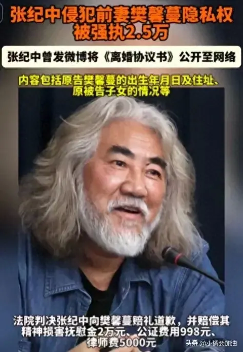 当年张纪中与前妻闹离婚时,张纪中未经过樊馨蔓同意,擅自将樊的出生年月日及住址、双方财产的分割情况等公开在网络上,严重侵犯了樊馨蔓的个人隐私,最终被法院判决,向樊赔礼道歉,并赔偿其精神损害抚慰金2万元、公证费用998元、律师费5000元,合计2.5998万元。