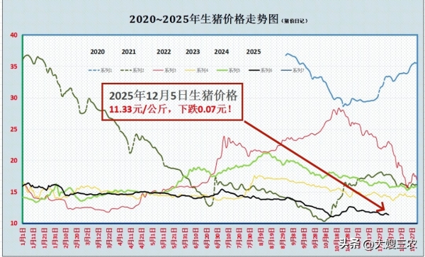 12月5日标猪价格下跌7分/公斤,均价11.33元/公斤,也就是5.665元/斤,再次跌破5.7元/斤。
