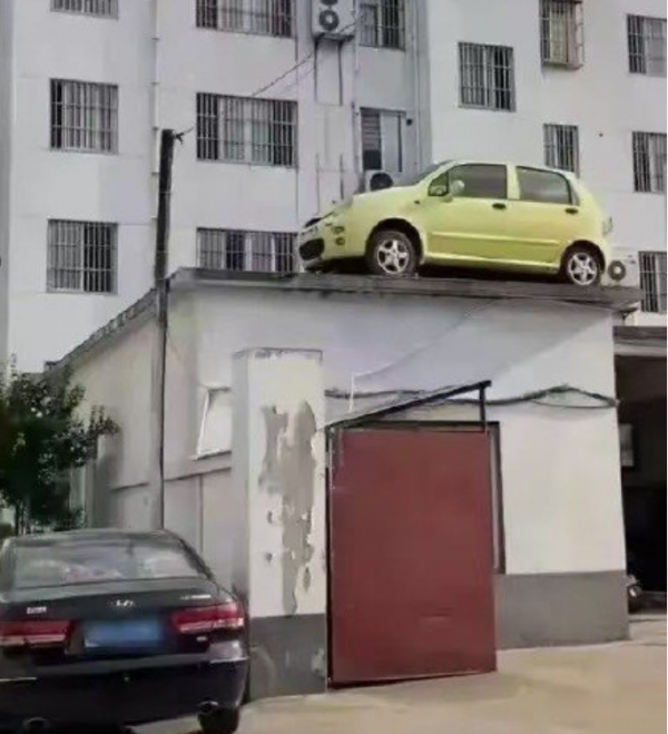 有些车主觉得,只是用几块石头把车垫起来,依然不能避免车辆被泡的命运,他们更倾向于把车停到高空,于是有条件的车主就把车停到了房顶的平台上。像这辆黄色的小汽车,就停在了一个平房的顶上,它距离里面足有几米高的,一般的雨水估计是威胁不到它了。